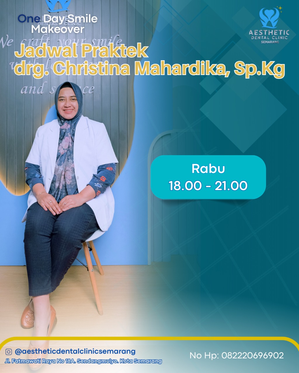 Dengan pendekatan yang ramah, teliti, dan berbasis ilmu terkini, drg. Christina Mahardika selalu berkomitmen memberikan pelayanan terbaik bagi setiap pasien. Temui beliau di Aesthetic Dental Clinic Semarang.