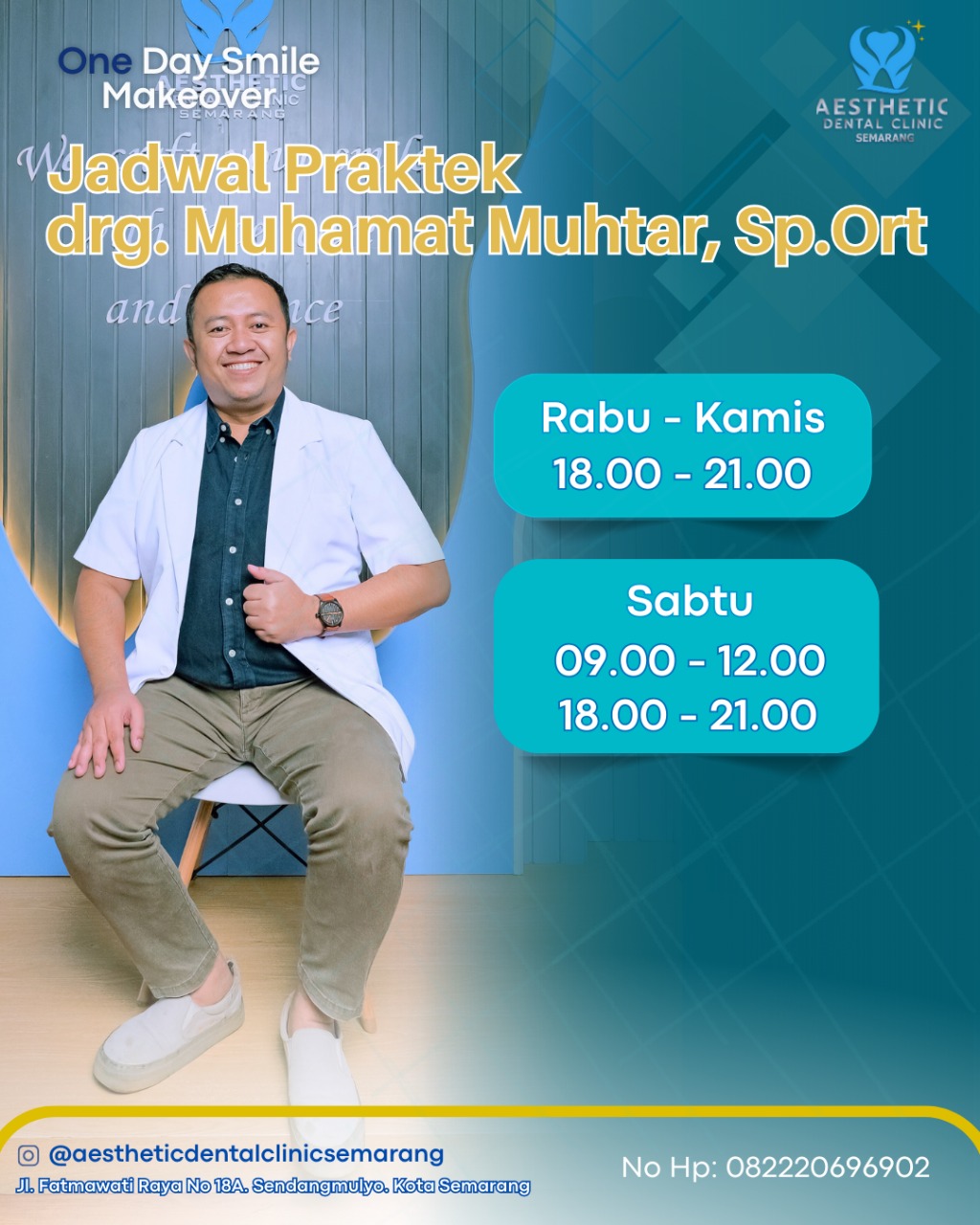 Temui drg. Muhamat Muhtar SA, M.Biomed., Sp.Ort. di Aesthetic Dental Clinic Semarang untuk mendapatkan perawatan orthodonti yang profesional, modern, dan terpercaya.