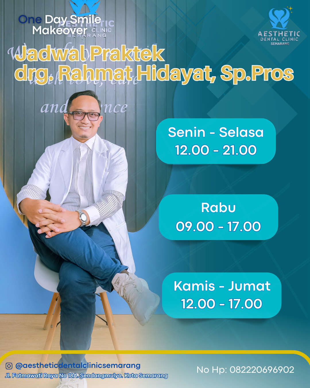 Dengan pengalaman yang luas dan komitmen pada kualitas, drg.Rahmat, MMRS, Sp.Pros terus berupaya memberikan pelayanan prostodonsia yang aman, presisi, dan sesuai kebutuhan individu setiap pasien. Buat janji temu dengan beliau di Aesthetic Dental Clinic Semarang.